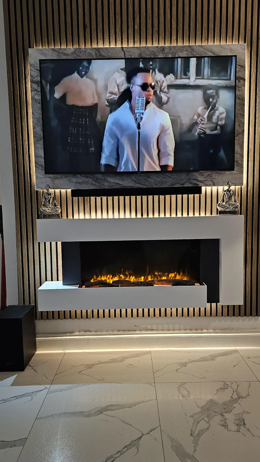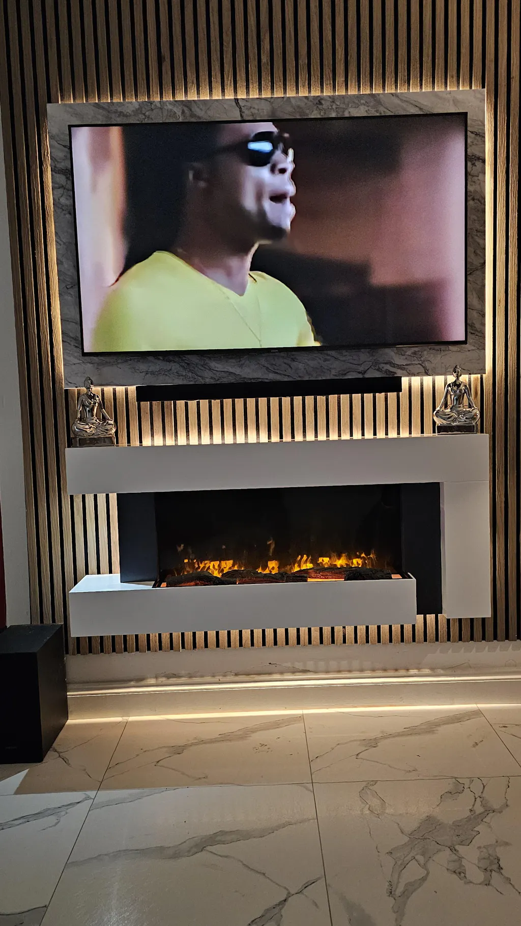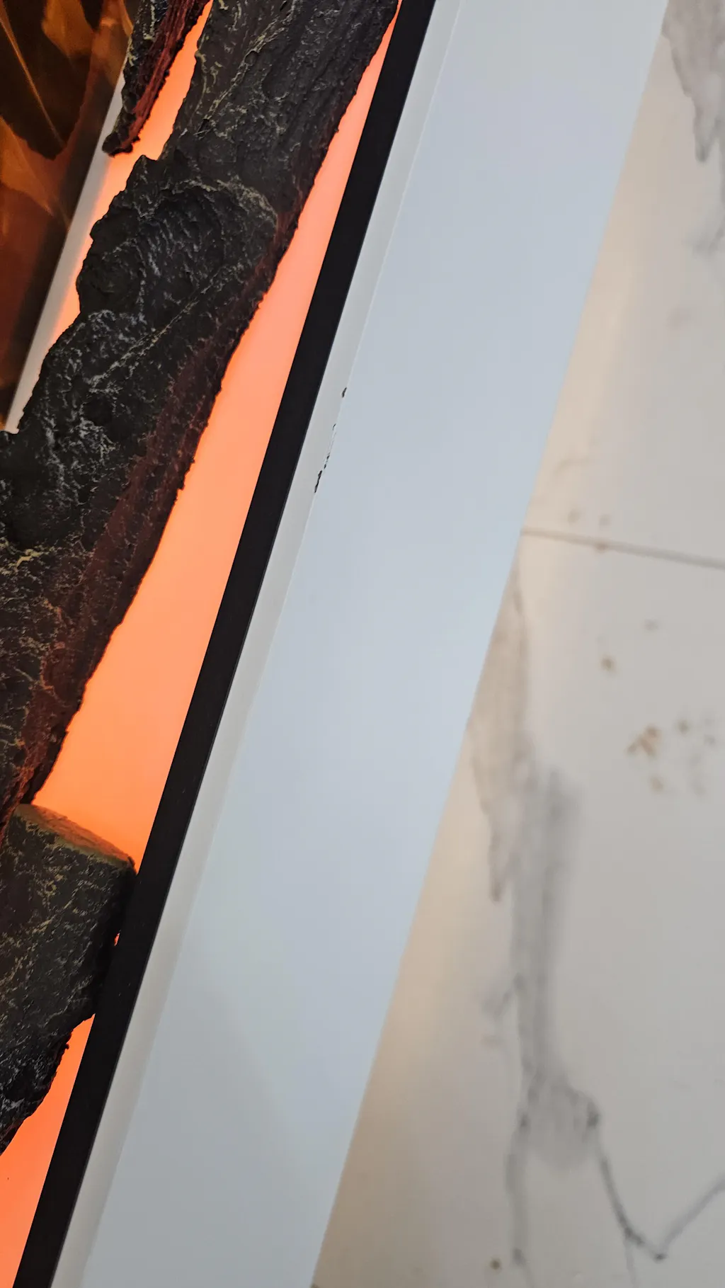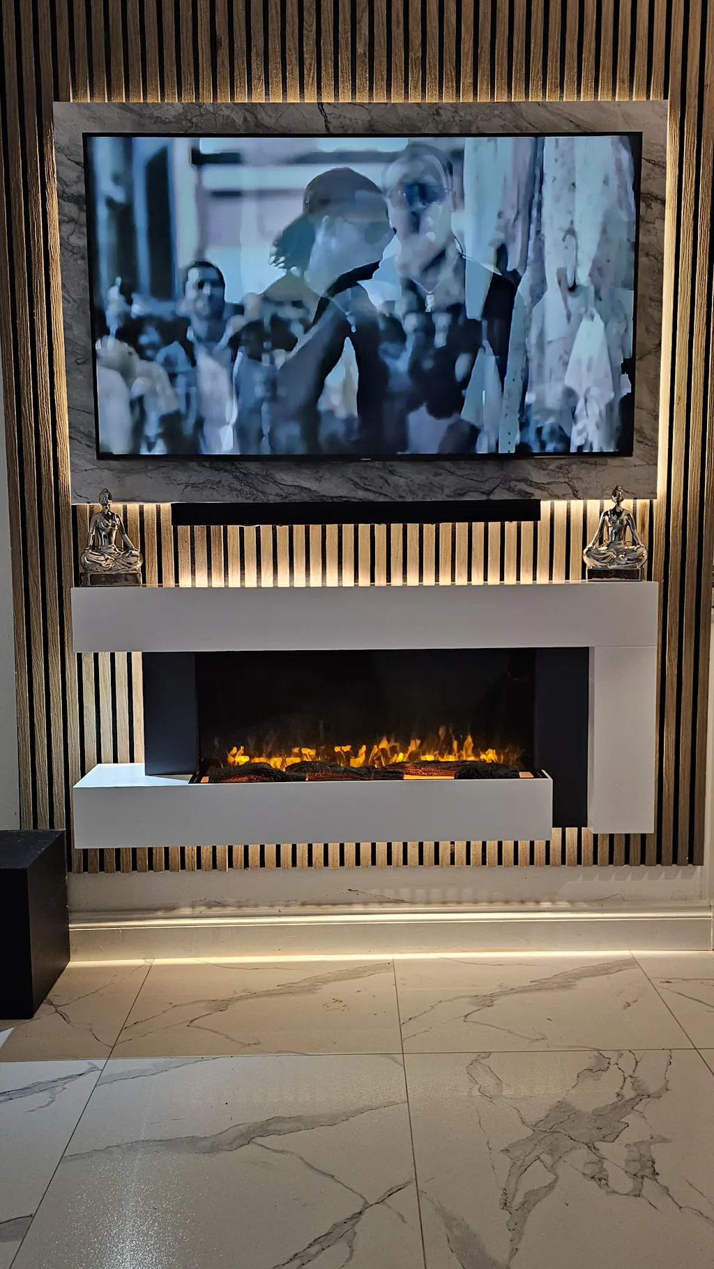 - Modern Wall-Mounted Design: Sleek white fireplace surround perfect for fireplace ideas in UK homes.