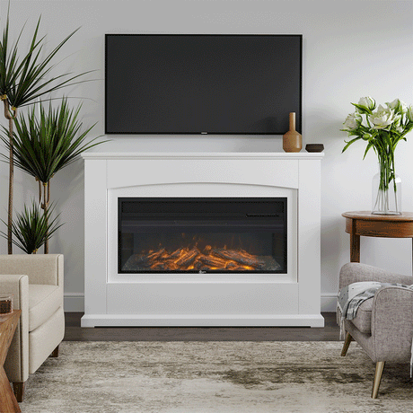 50-Inch LED Wall Mounted Electric Fire with White Wooden Frame