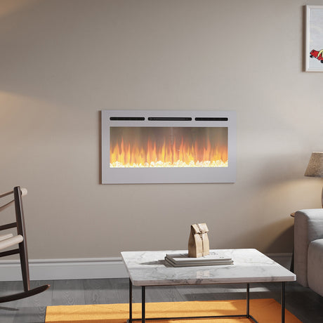 50-Inch LED Wall Mounted Electric Fire with White Wooden Frame