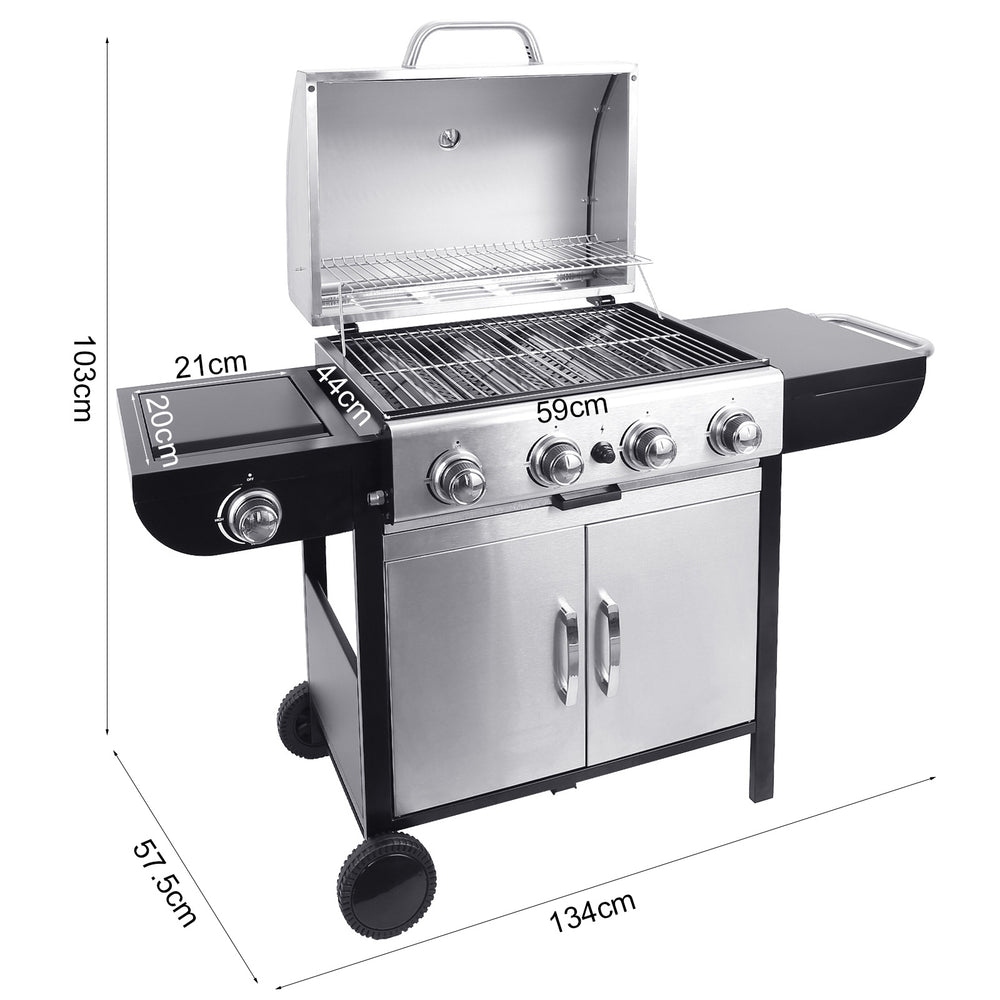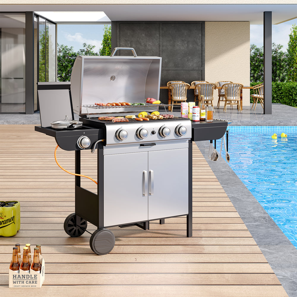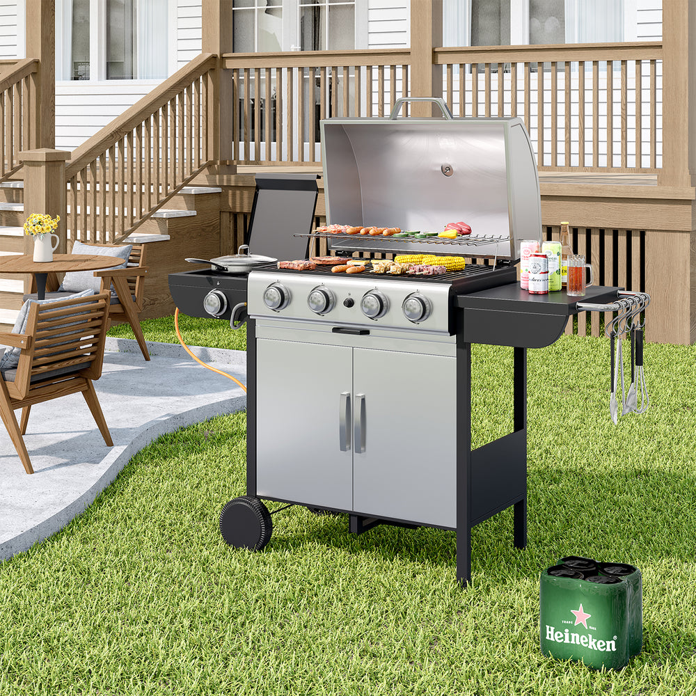 🔥 5-burner gas BBQ grill – 4 main burners + 1 side burner for flexible cooking.